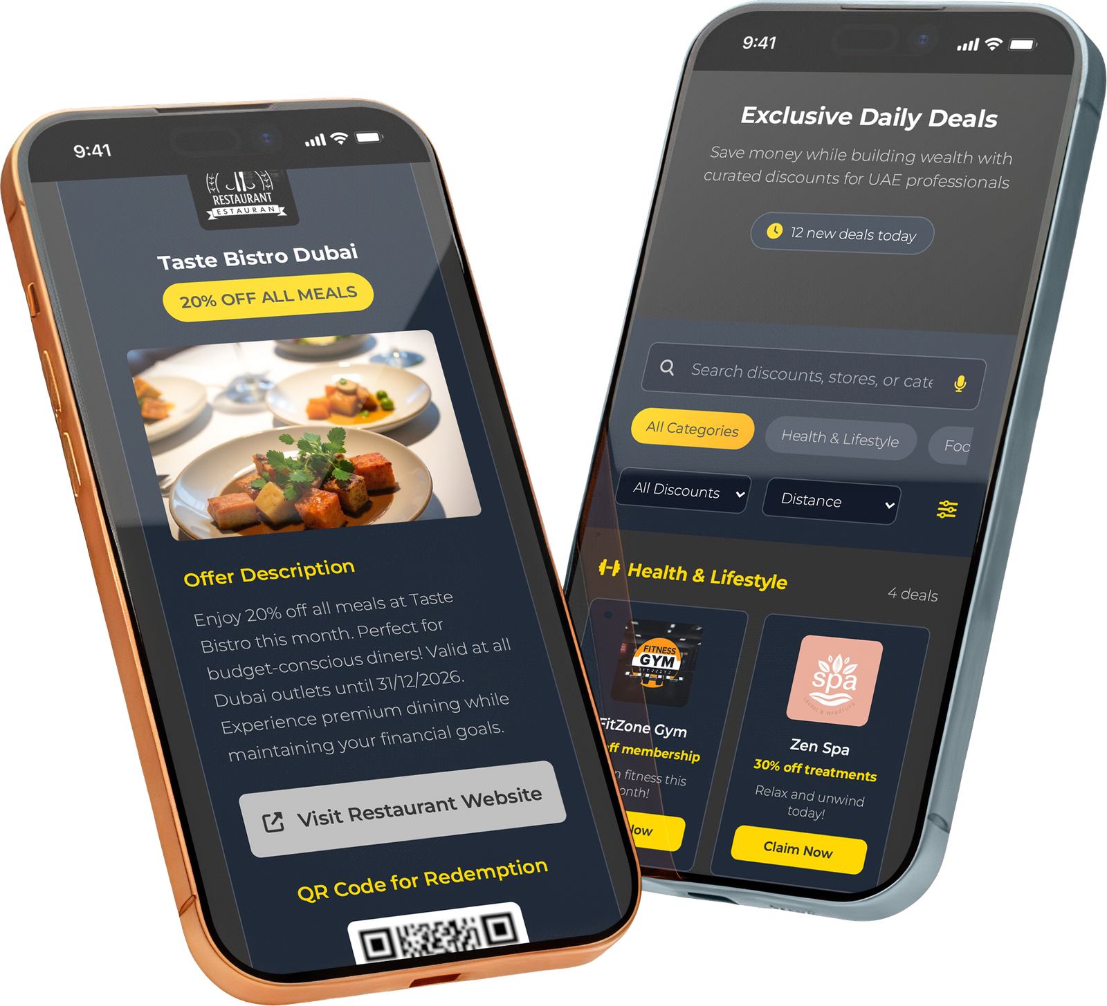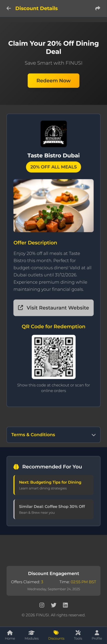 Our app teaches you to budget smarter with courses like the 50/30/20 rule, helping users save AED 500+ monthly. The "Discounts" section offers daily deals on food, clothing, and gyms, aligned with your budgeting goals. For example, 78% of UAE consumers seek app discounts, and our deals encourage repeat savings, fostering loyalty while you learn. Virtual tools let you practise budgeting risk-free, ensuring you apply skills to real-world expenses effectively.