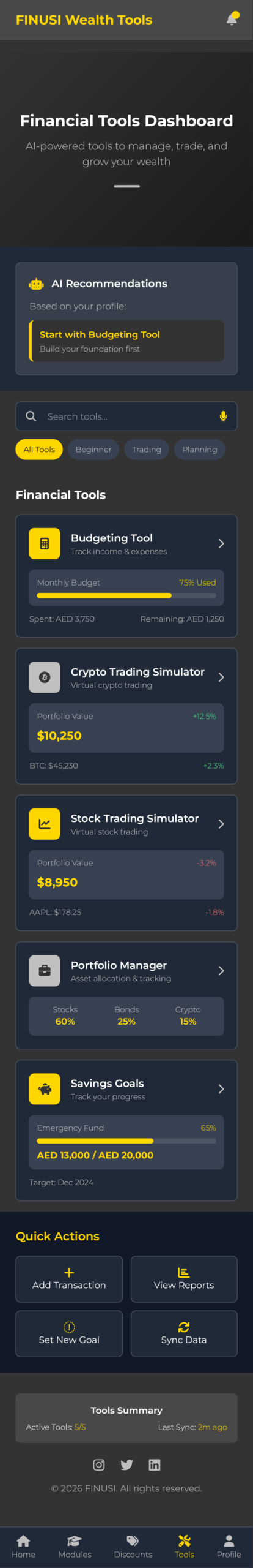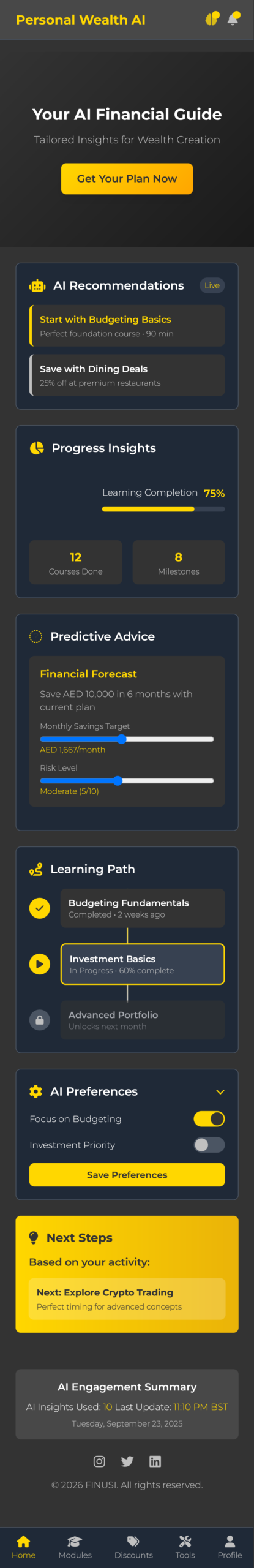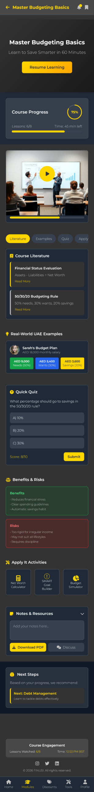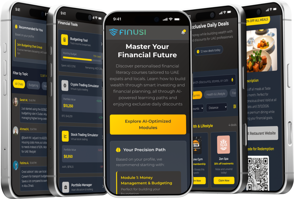 Finusi is a mobile-first app launching in Q2 2026, offering 225 interactive courses to boost financial literacy in the UAE, where only 30.7% of adults are financially literate. It’s for everyone, expats (88% of UAE’s 11M population), locals, and students, covering budgeting, saving, investing, and retirement planning. Whether you’re a beginner managing daily expenses or an intermediate planning wealth growth, our AI-tailored paths and bilingual (11 languages) content make financial success accessible. Start with a free quiz to find your path!