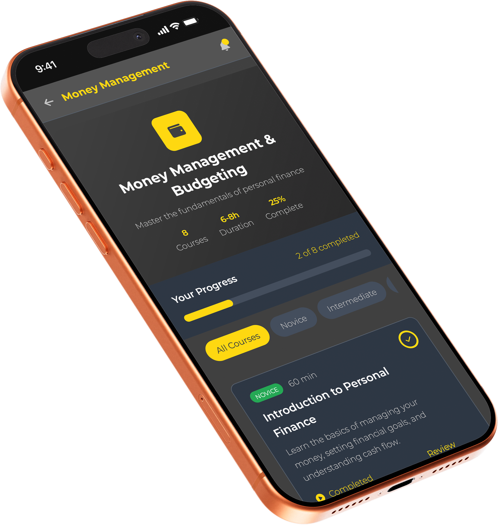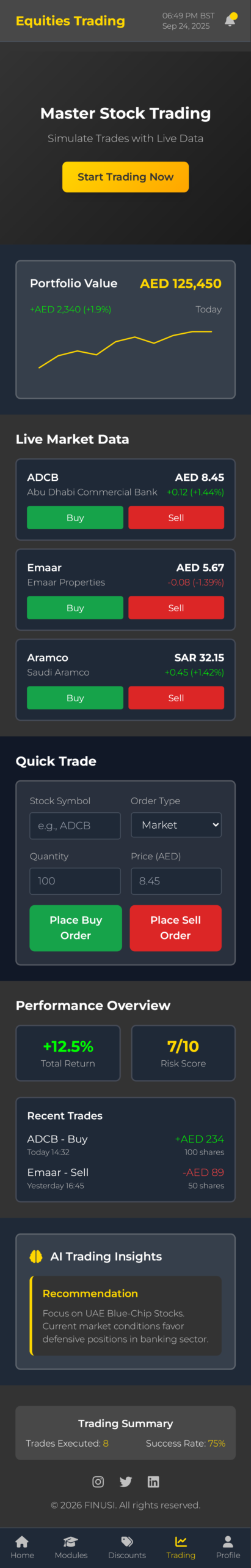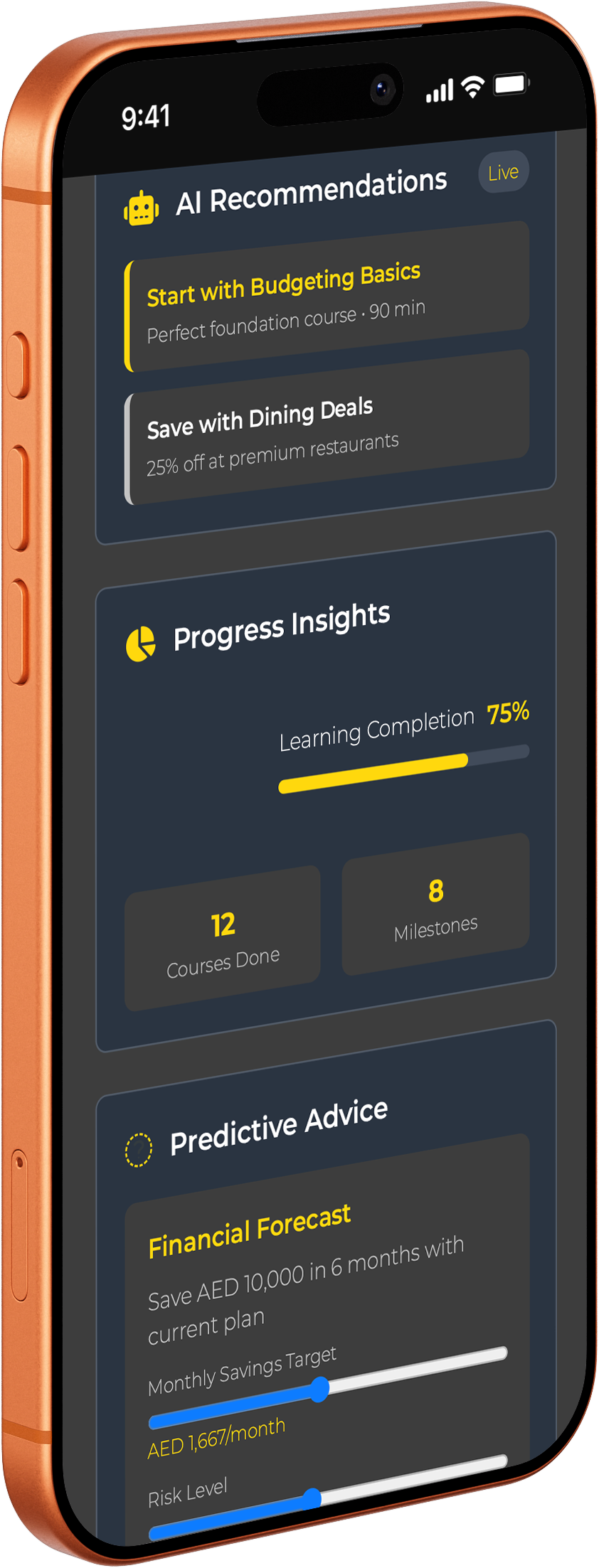 AI that personalizes your learning path based on your goals, whether reducing debt or building an emergency fund. Gamification keeps you motivated with badges and streaks, while interactive tools let you practise without risk, like virtual portfolio simulations. And because life in Dubai is fast-paced, everything’s offline-ready and bilingual (Arabic/English). Supported by UAE government initiatives like the ADIB 2025 Financial Education Programme, we’re here to help you thrive.
